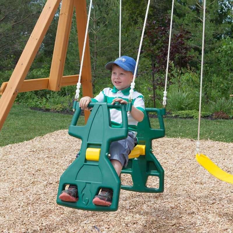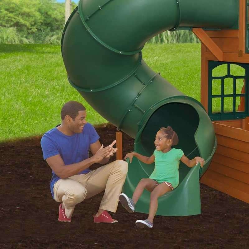 Picture a two-level playhouse with its giant super-slide and swing set to boot. Now picture enough fun activities to entertain ten kids at once. Put them together and you have the mighty, multitasking Cloverdale Wooden Swing Set. The two classic belt swings would’ve been plenty of fun, even without the premium glider that seats one or two. And they could have left out the play clock with moveable hands or the chalkboard tarp. But that’s just not us. They even added a few nice things for grownups—like 100% premium cedar lumber and sturdy, pre-assembled panels that make assembly easier.